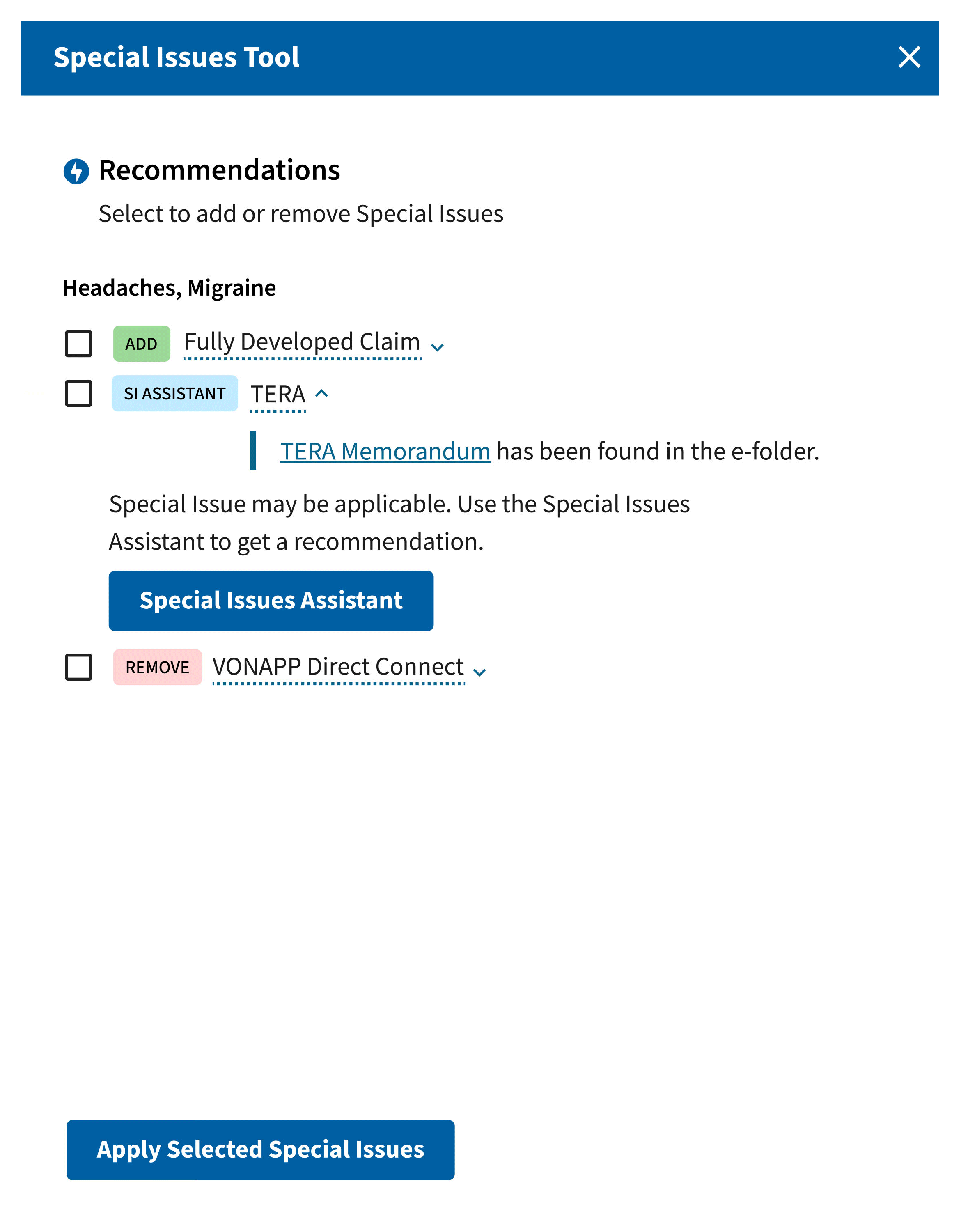 I led the UX design for the Special Issues Tool, a new internal web app that helps Veterans Affairs staff identify and track complex benefit issues faster, with less confusion and fewer manual steps.